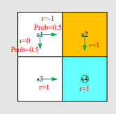 [ v π ( s 1 ) v π ( s 2 ) v π ( s 3 ) v π ( s 4 ) ] = [ 0.5 ( 0 ) + 0.5 ( − 1 ) 1 1 1 ] + γ [ 0 0.5 0.5 0 0 0 0 1 0 0 0 1 0 0 0 1 ] [ v π ( s 1 ) v π ( s 2 ) v π ( s 3 ) v π ( s 4 ) ] . \begin{bmatrix} v_{\pi}(s_1)\\ v_{\pi}(s_2)\\ v_{\pi}(s_3)\\ v_{\pi}(s_4) \end{bmatrix} = \begin{bmatrix} 0.5(0)+0.5(-1)\\ 1\\ 1\\ 1 \end{bmatrix} +\gamma \begin{bmatrix} 0 & 0.5 & 0.5 & 0\\ 0 & 0 & 0 & 1\\ 0 & 0 & 0 & 1\\ 0 & 0 & 0 & 1 \end{bmatrix} \begin{bmatrix} v_{\pi}(s_1)\\ v_{\pi}(s_2)\\ v_{\pi}(s_3)\\ v_{\pi}(s_4) \end{bmatrix}. v π ( s 1 ) v π ( s 2 ) v π ( s 3 ) v π ( s 4 ) = 0.5 ( 0 ) + 0.5 ( − 1 ) 1 1 1 + γ 0 0 0 0 0.5 0 0 0 0.5 0 0 0 0 1 1 1 v π ( s 1 ) v π ( s 2 ) v π ( s 3 ) v π ( s 4 ) .