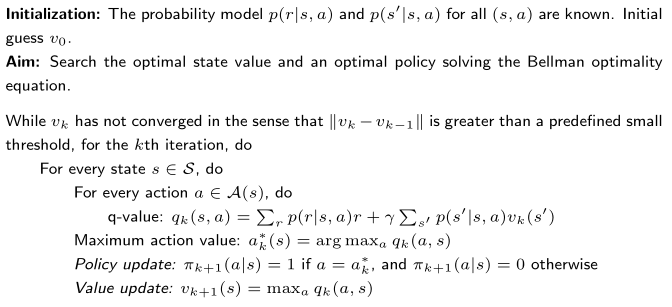 - 价值更新:vk+1(s)=maxaqk(s,a)