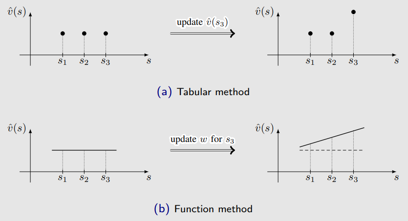 - 泛化能力: 一旦状态 s 被访问,参数 w 被更新,其他未访问状态的值也可能被间接更新。