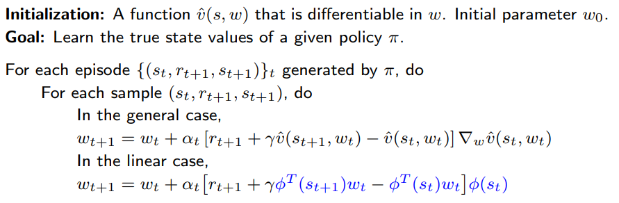 wt+1=wt+αt[rt+1+γv^(st+1,wt)−v^(st,wt)]∇wv^(st,wt)
