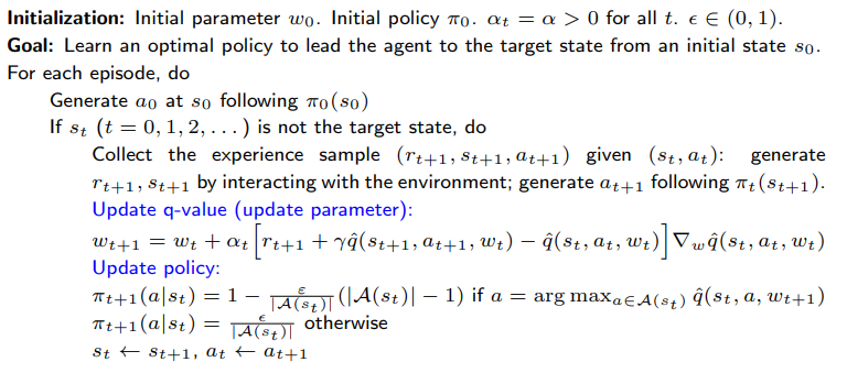 使用值函数逼近的 Sarsa 算法(SARSA with function approximation)如下: