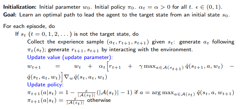 wt+1=wt+αt[rt+1+γq^(st+1,at+1,wt)−q^(st,at,wt)]∇wq^(st,at,wt)