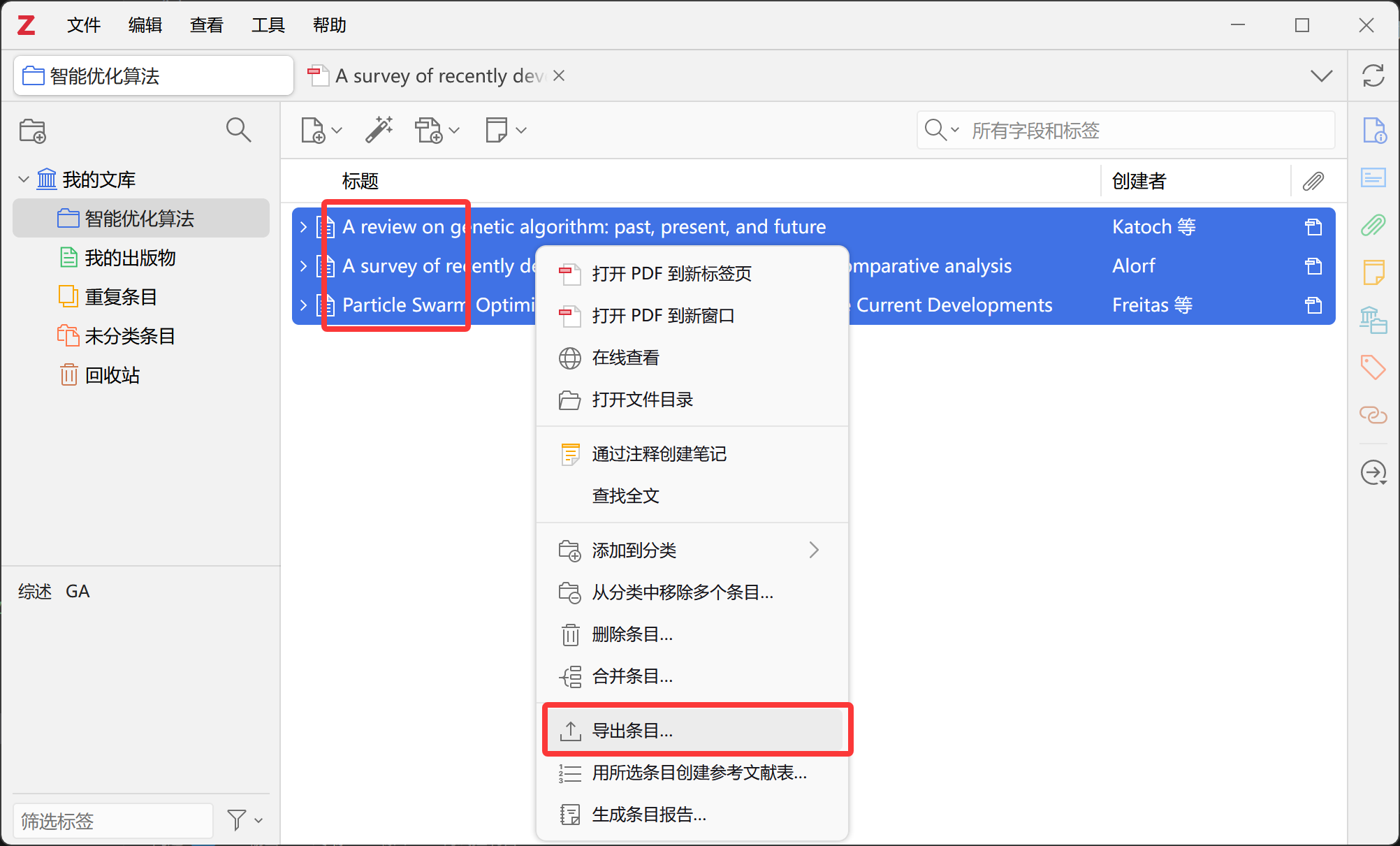 在 Zotero 主界面中,选中需要导出的文献条目(可多选),右击后点击 “导出条目…”。