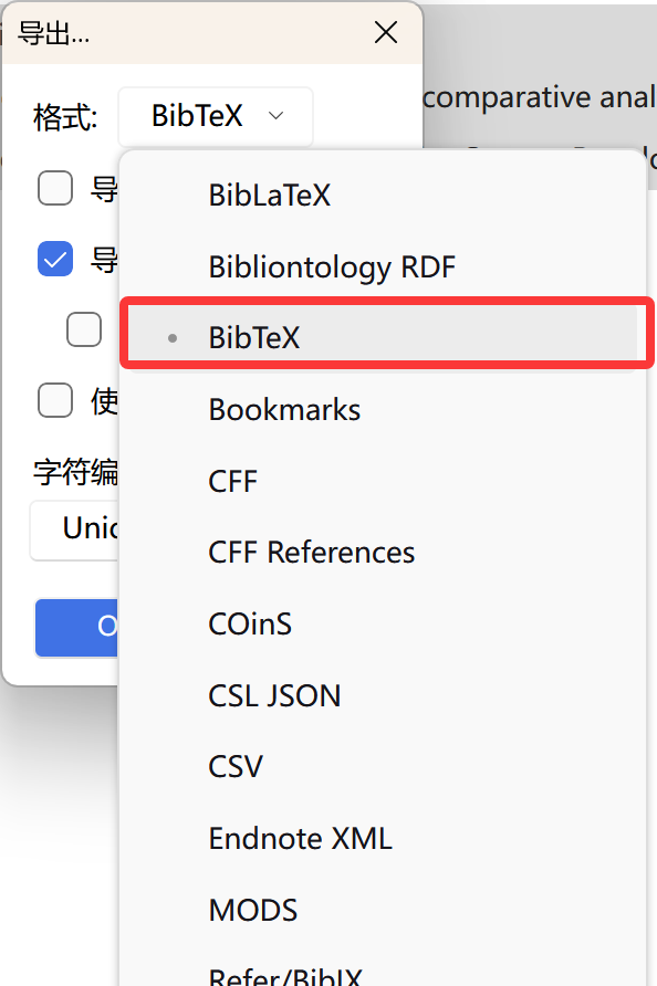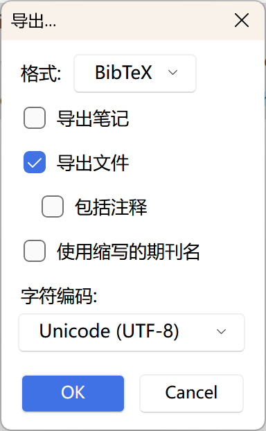 在“格式”选项中选择 BibTeX,并勾选 “导出文件”。这样不仅会生成 .bib 文献数据库文件,还会同时导出与条目关联的 PDF 文献。